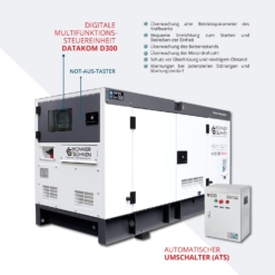 - Garso izoliacijos korpusas užtikrina tylų veikimą (72 dB 7m atstumu), o pažangi Datakom D300 valdymo sistema su ATS jungtimi leidžia automatizuoti paleidimą ir sustabdymą.