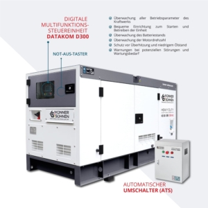 Specifikacija Darbinė įtampa, V:230/400Didžiausia galia/Nominali galia (400V), kVA:50/45Galios koeficientas, cos φ:1 (230V)/0,8 (400V)Dažnis, Hz:50**Didžiausia srovė vienai fazei, A:72.2Kuro sąnaudos***, l/h:4,43 (esant 50 % apkrovai)Korpusas:garsui nepralaidus, atsparus drėgmei, tinkamas bet kokioms oro sąlygomsTriukšmo lygis Lpa (7m)/Lwa, dB:72/97Skaitmeninis:multifunkcinis skaitmeninis reguliatoriusValdymo bloko modelis:Datakom D300Generatorius:Stamford tipo, sinchroninis, su sužadinimo sistema, AC bešepetėlis, keturių poliųVariklio tipas:Vandeniu aušinamas keturių cilindrų, keturtaktis dyzelinis variklisVariklio gamintojas:BaudouinVariklio modelis:4M06G50/5Variklio apsukos, U/min:1500Aušinimo tipas:SkystisVariklio apsukų valdymas:elektroninisEsant šaltam varikliui funkcija:+ATS jungtis:+Kuro bako talpa, l:78Variklio alyvos kiekis, l:11.5Aušinimo skysčio kiekis, l:5Darbinis tūris, cm3:2300Akumuliatorius, A·h:85Akumuliatoriaus įkrovimo modulis:integruotasGamintojo garantija:1 metaiApsaugos klasė:IP54Matmenys grynasis (PxPxA), mm:2280×900×1070Matmenys bruto (PxPxA), mm:2310×930×1090Grynasis svoris, kg:866Svoris:866.0 kg
