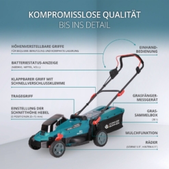 • Lengva ir patogi naudoti, su 30 litrų talpos surinkimo krepšiu ir mulčiavimo funkcija, kuri papildomai tręšia veją.