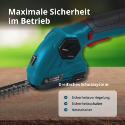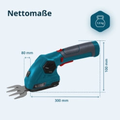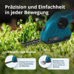 | Komplektacija | Žirklės, krūmų ašmenys, žolės ašmenys, USB/Type-C įkrovimo laidas, naudojimo instrukcija, saugos jungiklis |