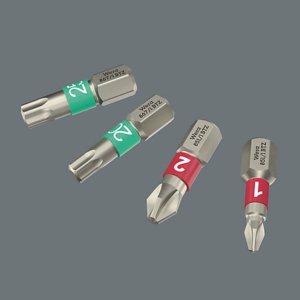• Visi antgaliai aprūpinti „Take it easy“ įrankių ieškikliu: spalvota juostelė (spalva nurodo varžto profilį) taip pat turi antspaudą su dydžio informacija, kuris leidžia lengvai rasti tinkamą antgalį.