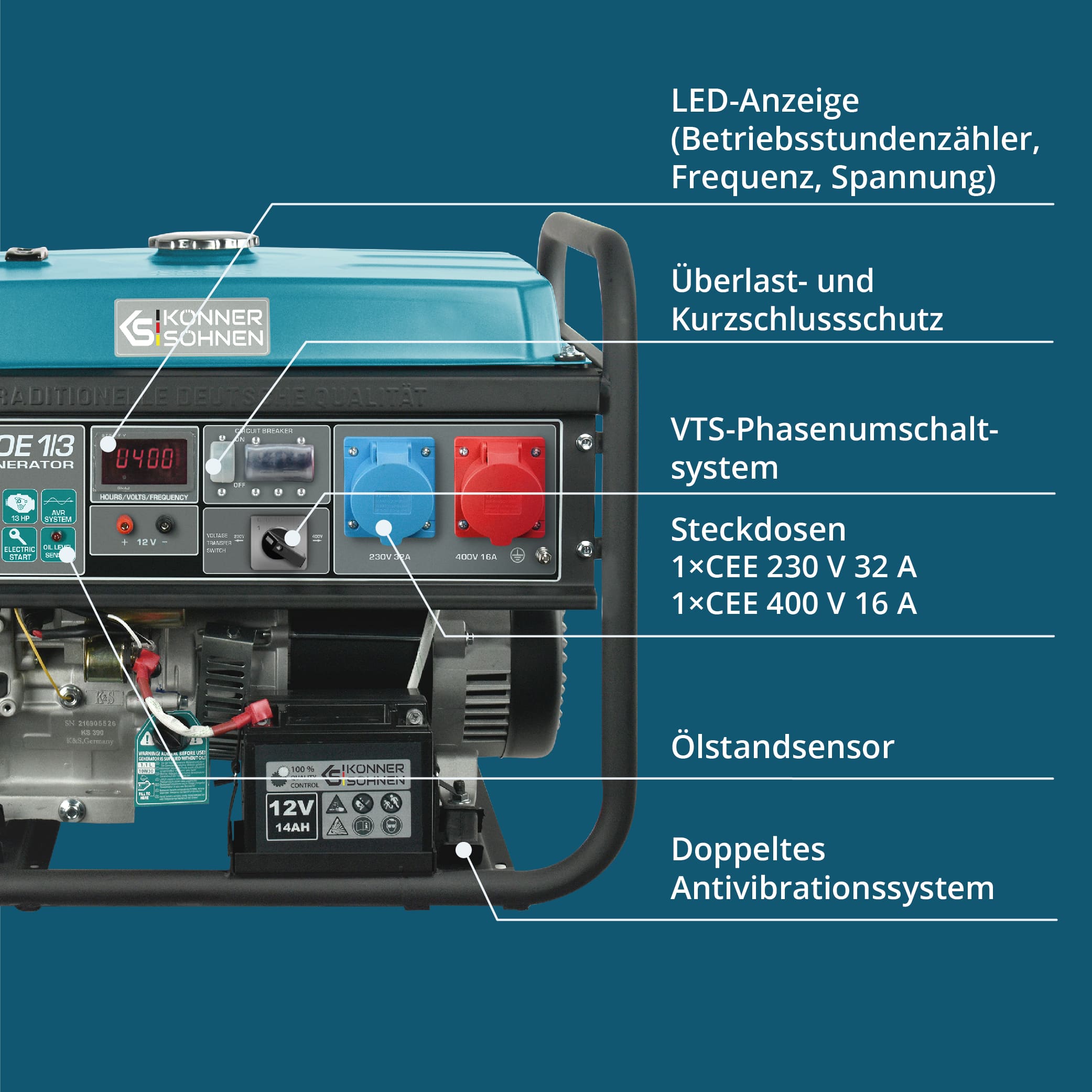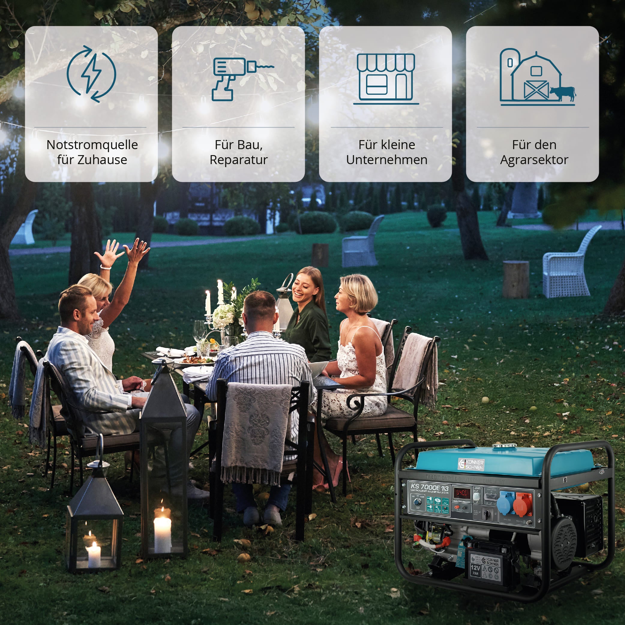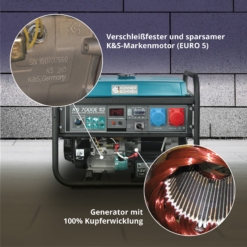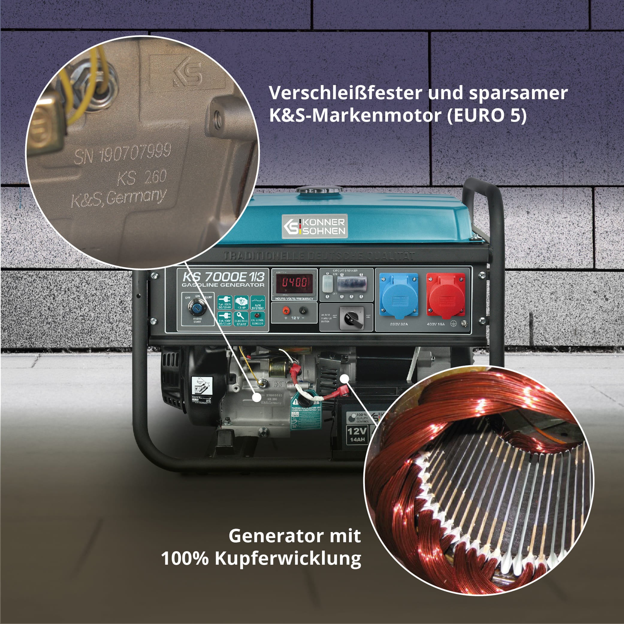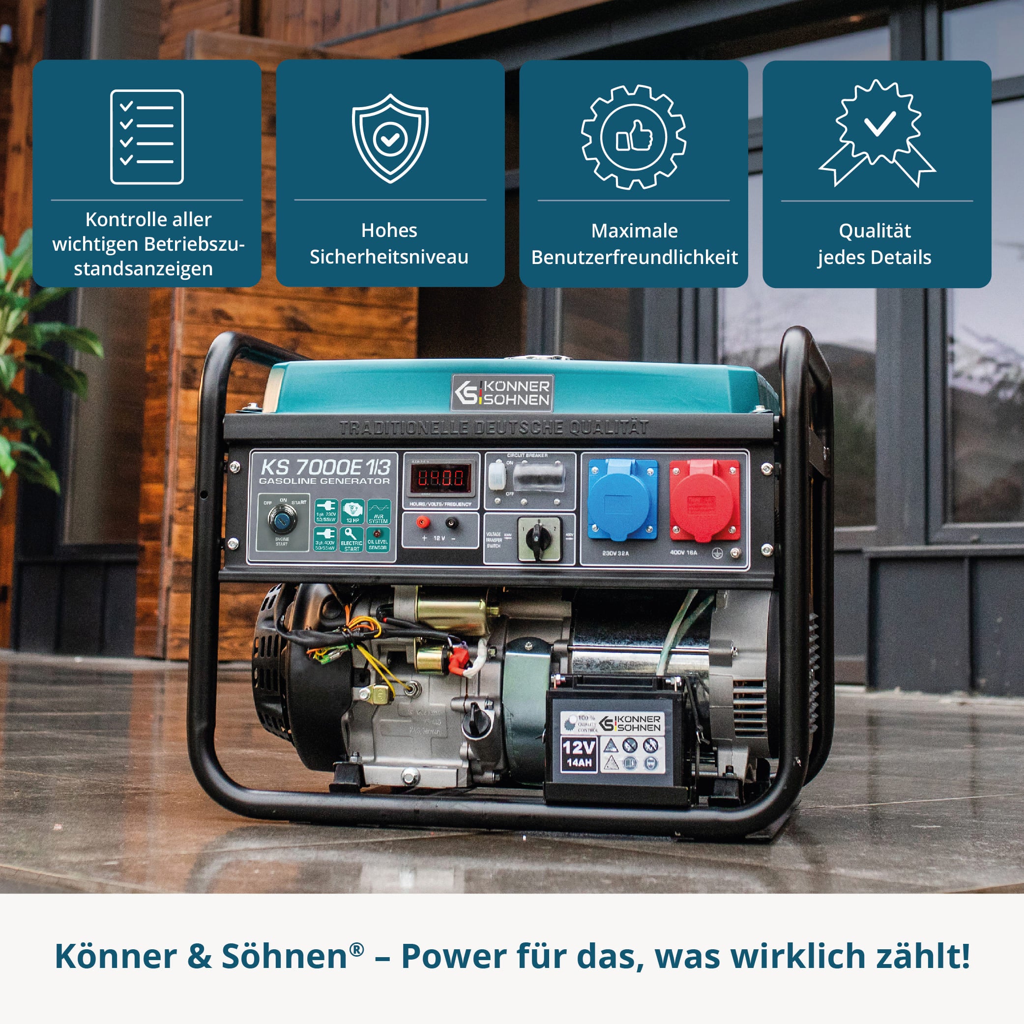 - „Könner & Söhnen" KS 7000E-1/3 – tai galingas benzininis generatorius, galintis tiekti tiek vienfazę (230V), tiek trifazę (400V) elektros energiją, todėl idealiai tinka įvairioms reikmėms.