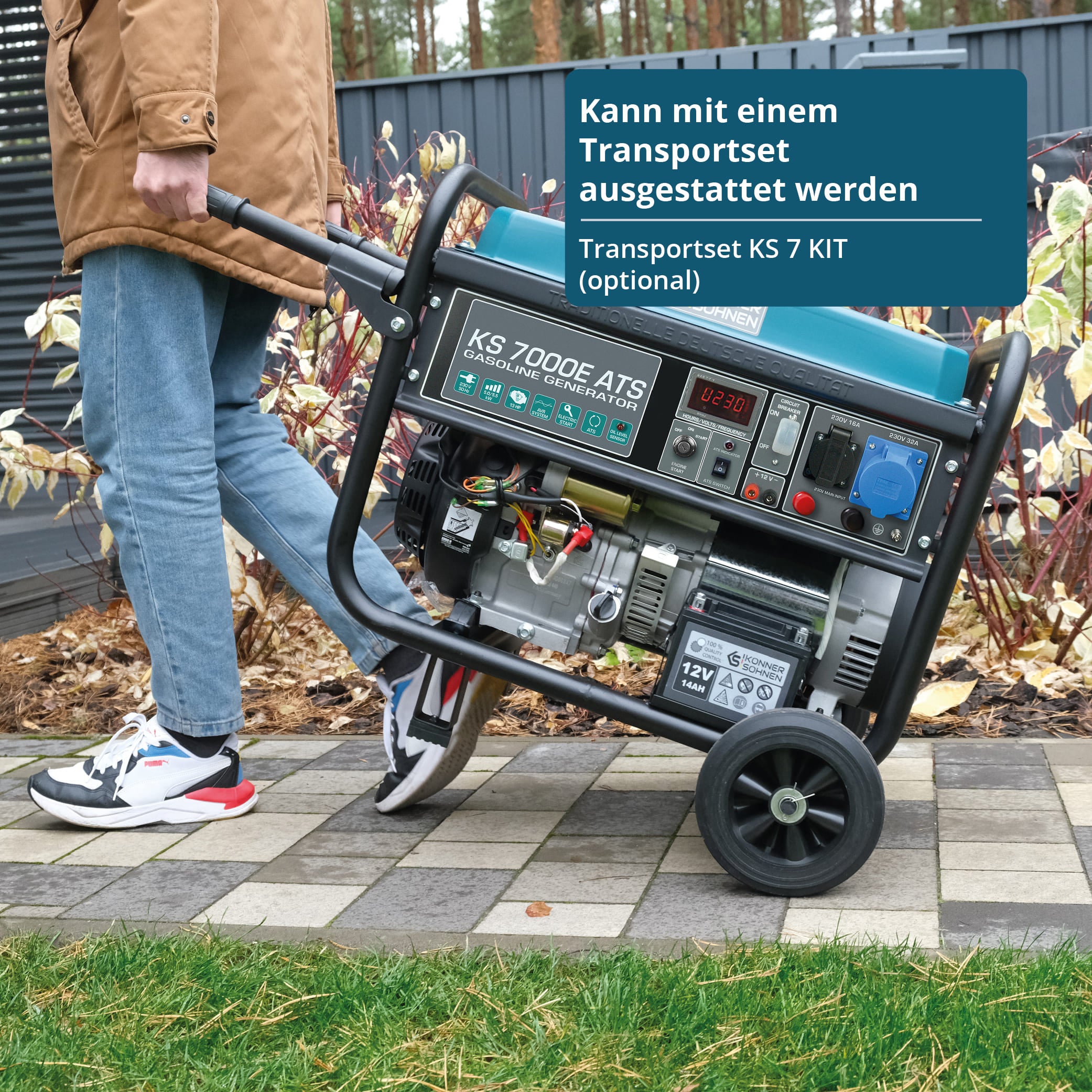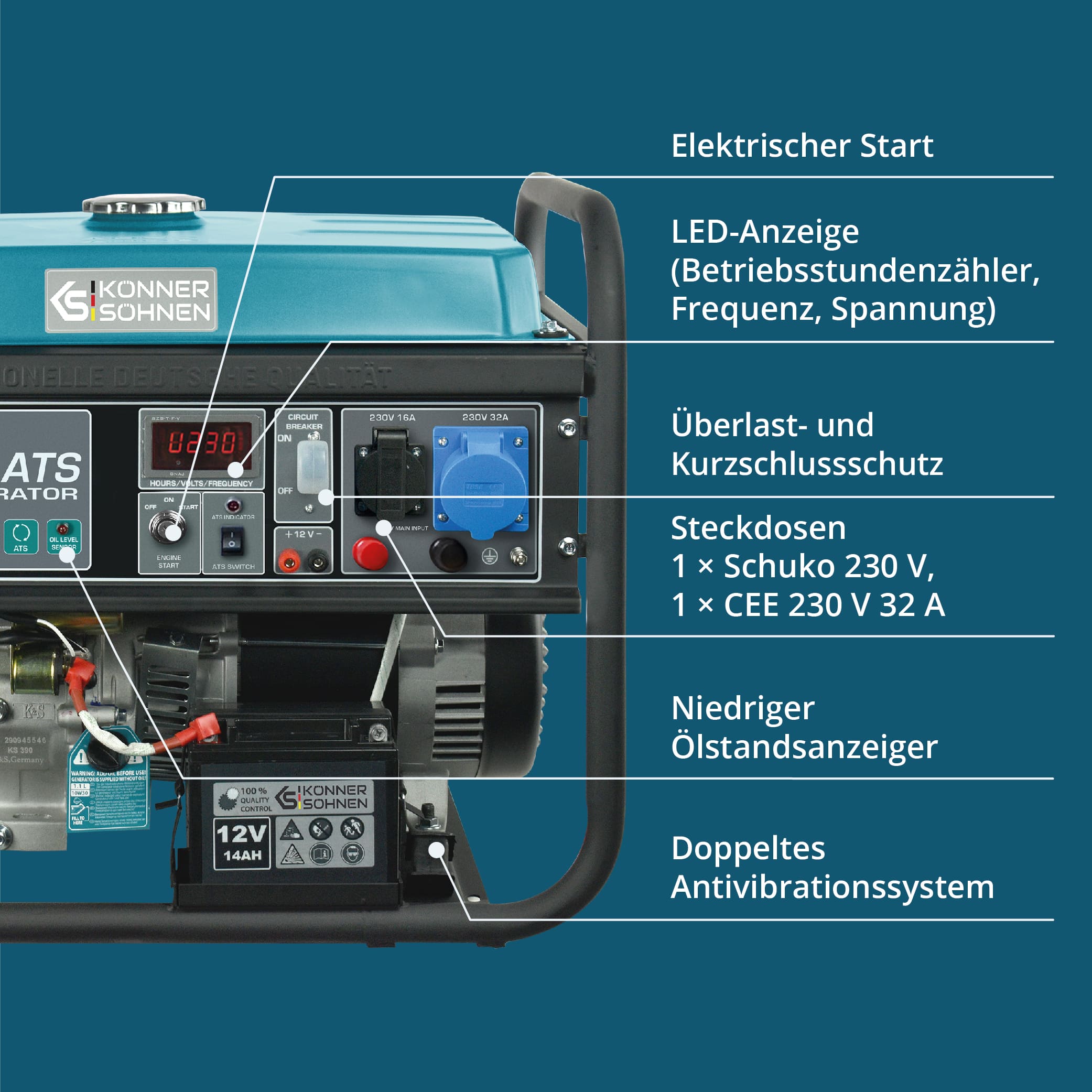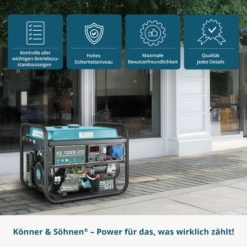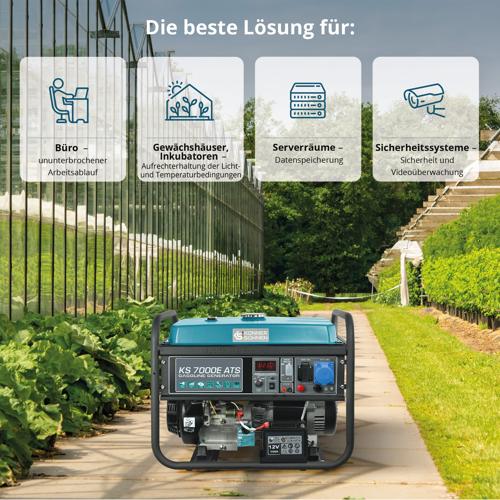 - „Könner & Söhnen" KS 7000E ATS – tai patikimas benzininis generatorius su automatinio paleidimo sistema (ATS), užtikrinantis nepertraukiamą elektros tiekimą net dingus pagrindiniam maitinimui.