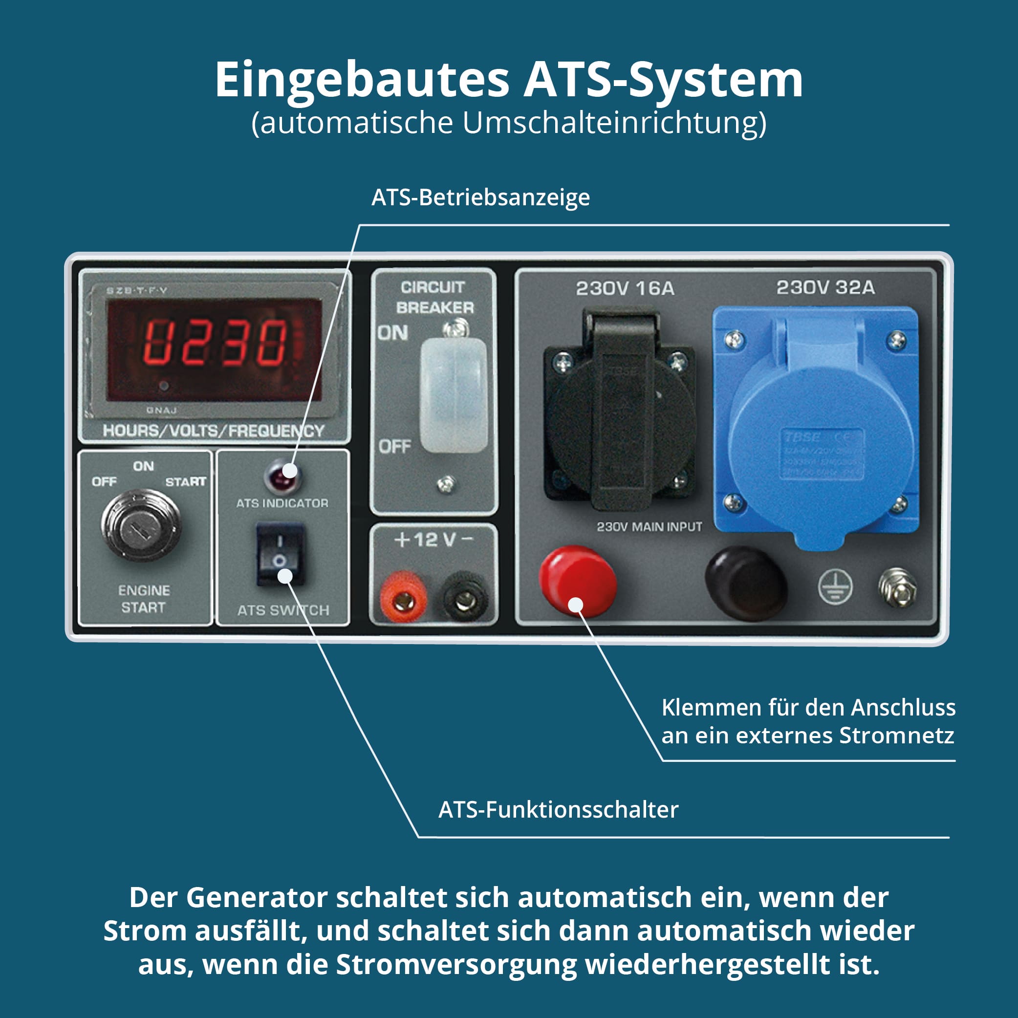 - Didelė 25 litrų kuro bako talpa leidžia dirbti iki 17 valandų esant 50% apkrovai, o integruota ATS funkcija automatiškai perjungia generatorių įjungus arba išjungus tinklo maitinimą.