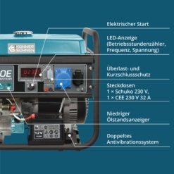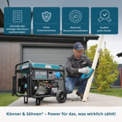 - „Könner & Söhnen" KS 7000E – patikimas ir efektyvus benzininis generatorius su elektriniu paleidimu, užtikrinantis patogumą ir energijos tiekimą kritinėse situacijose.