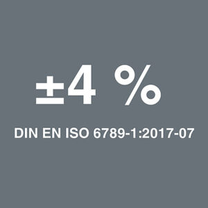 - Tikslumas iki ± 4 % pagal DIN EN ISO 6789-1:2017-07.