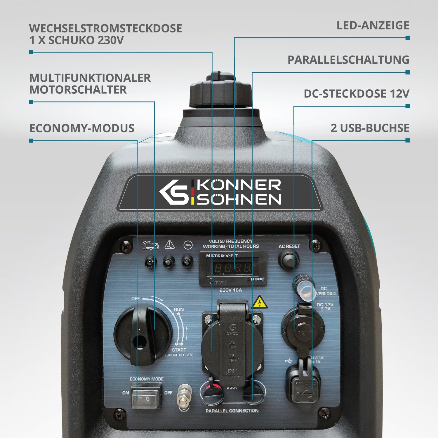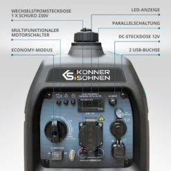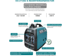 - Kompaktiškas ir lengvas "Könner & Söhnen" KS 2100i S inverterinis generatorius užtikrina švarų ir stabilų elektros tiekimą, idealiai tinkantį jautriai elektronikai.