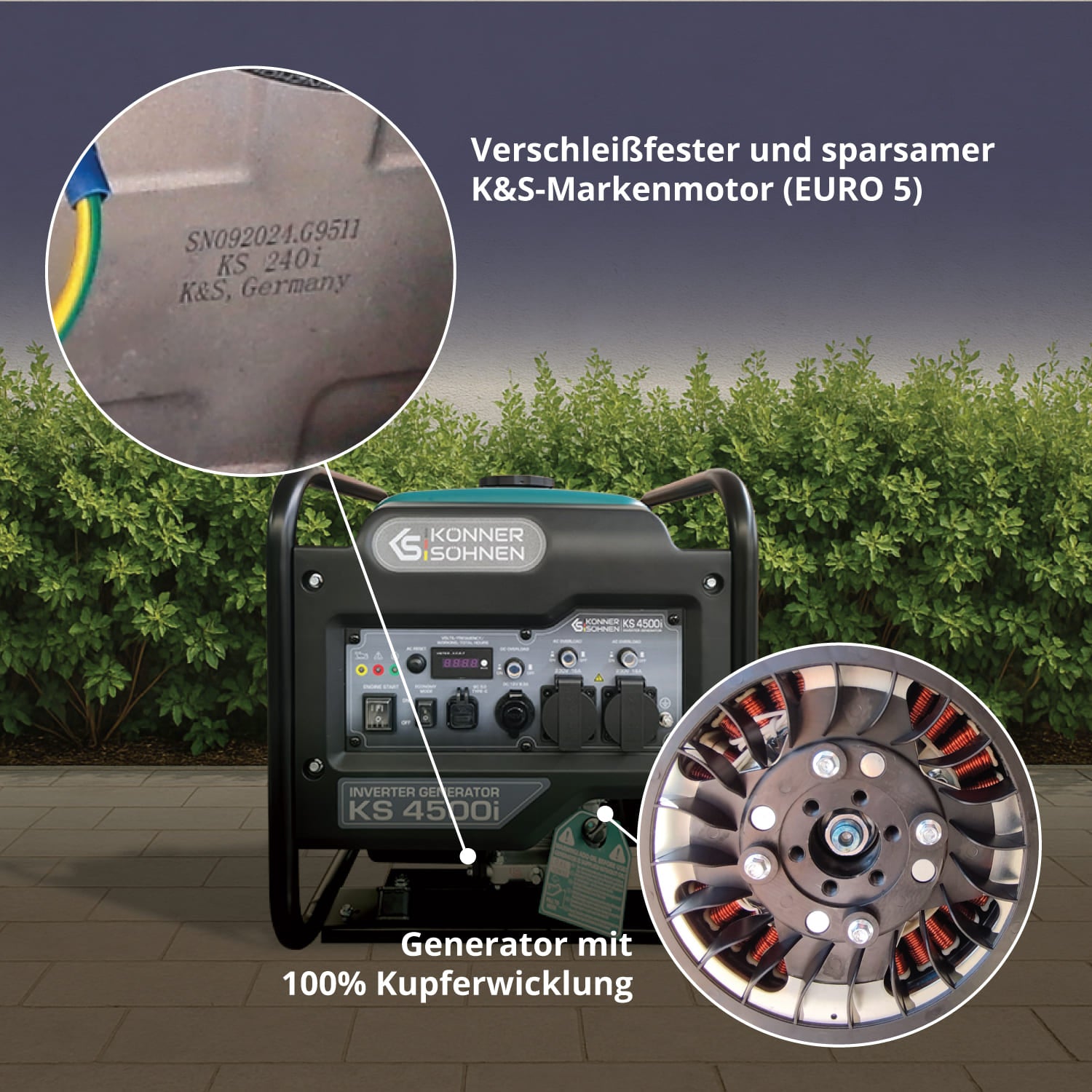 - "Könner & Söhnen" KS 4500i inverterinis generatorius pasižymi aukšta galia ir efektyvumu, tiekiant stabilų 230 V maitinimą.