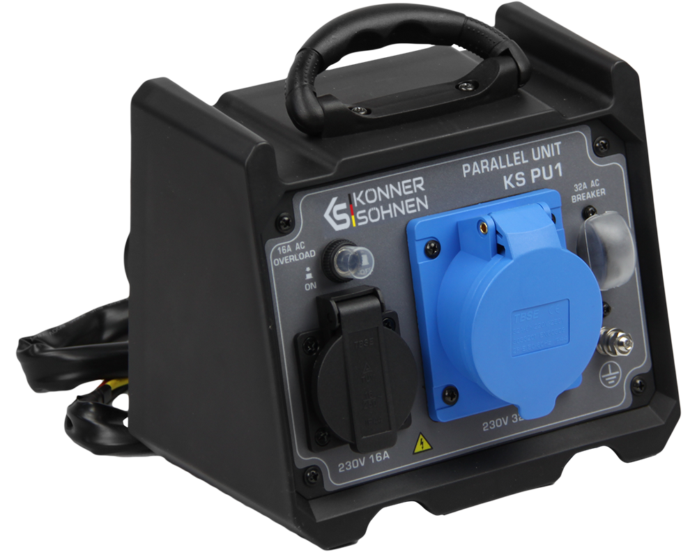 - KS PU1 lygiagretaus jungimo dėžutė leidžia patogiai ir saugiai sujungti du vienodus Könner & Söhnen generatorius, padidinant bendrą galią.