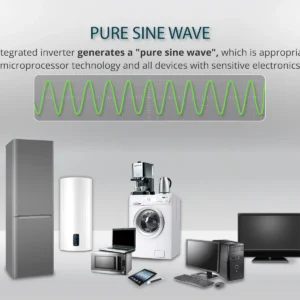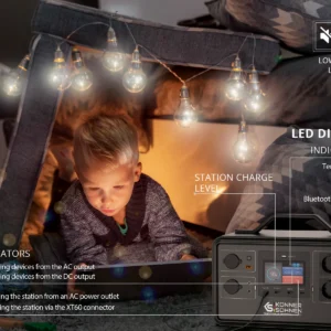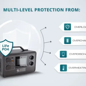 - Aukštos kokybės „LifePO4“ akumuliatorius, skirtas tiek įrangai maitinti, tiek prietaisams įkrauti