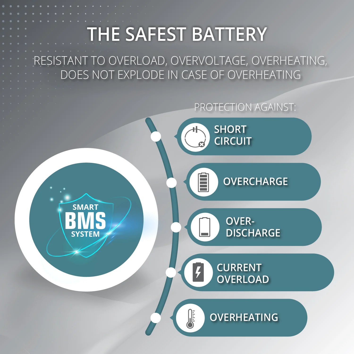 Aukštos kokybės ličio geležies fosfato akumuliatorius, užtikrina įspūdingą 6000 įkrovimo ciklų skaičių.