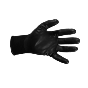 - Besiūlė megzta pirštinė iš plono pamušalo nailono/akrilo, panardinta į juodą nitrilo putą delne ir pirštų galiukuose.