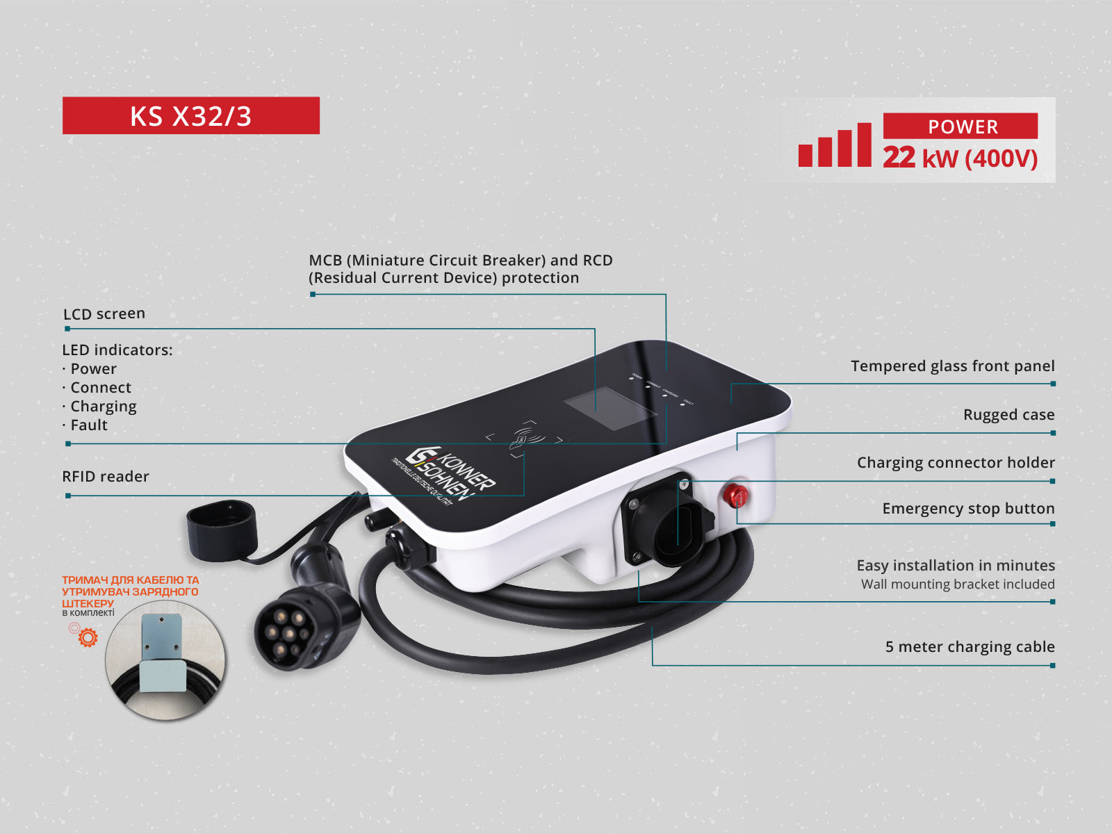 - „Könner & Söhnen" KS X32/3 – tai galinga 22 kW galios sieninė įkrovimo stotelė, skirta elektromobiliams krauti.