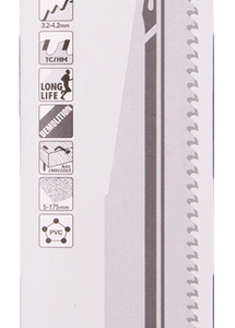 - Tiesinio pjūklo pjūklelis, skirtas medienai ir metalui pjauti. Ašmenys pagaminti iš TC/HM medžiagos.