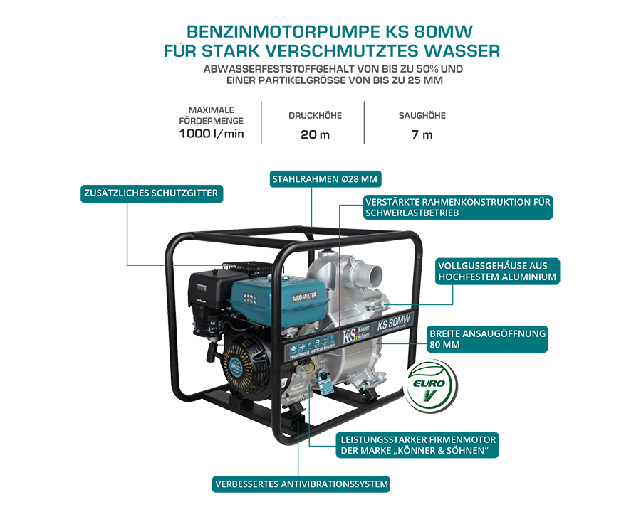 - „Könner & Söhnen" KS 80MW – specializuotas variklinis siurblys, skirtas pumpuoti vandenį su dumblu ir šiukšlėmis, idealiai tinkantis statybvietėms, tvenkiniams ir potvynių paveiktoms teritorijoms valyti.