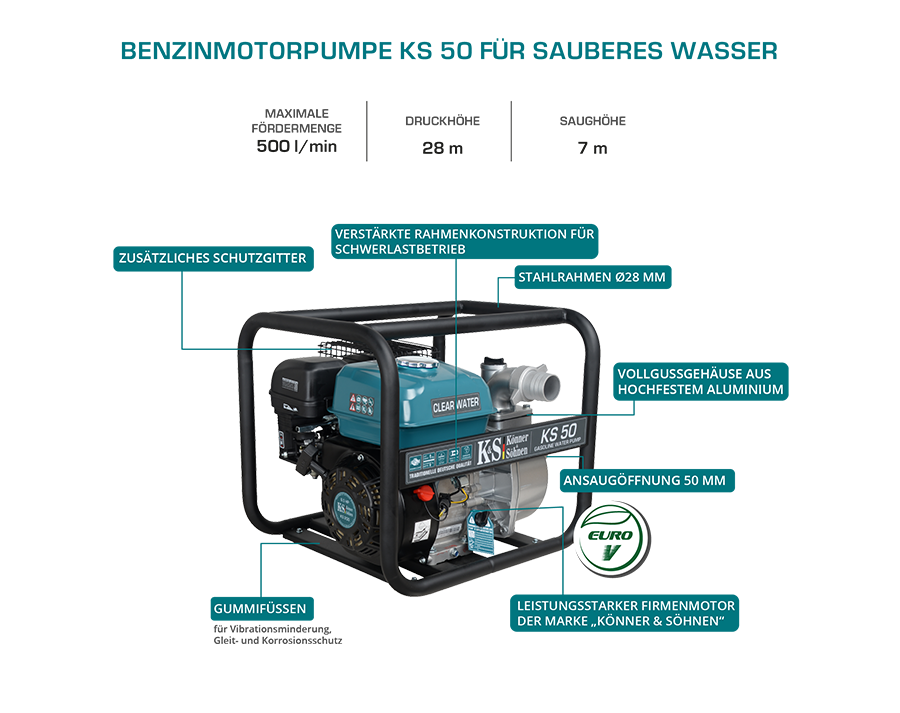 - „Könner & Söhnen" KS 50 – efektyvus variklinis siurblys, skirtas švariam vandeniui pumpuoti, idealiai tinkantis sodininkystei, drėkinimui ir buitinėms reikmėms.